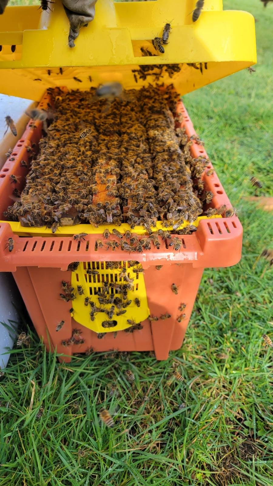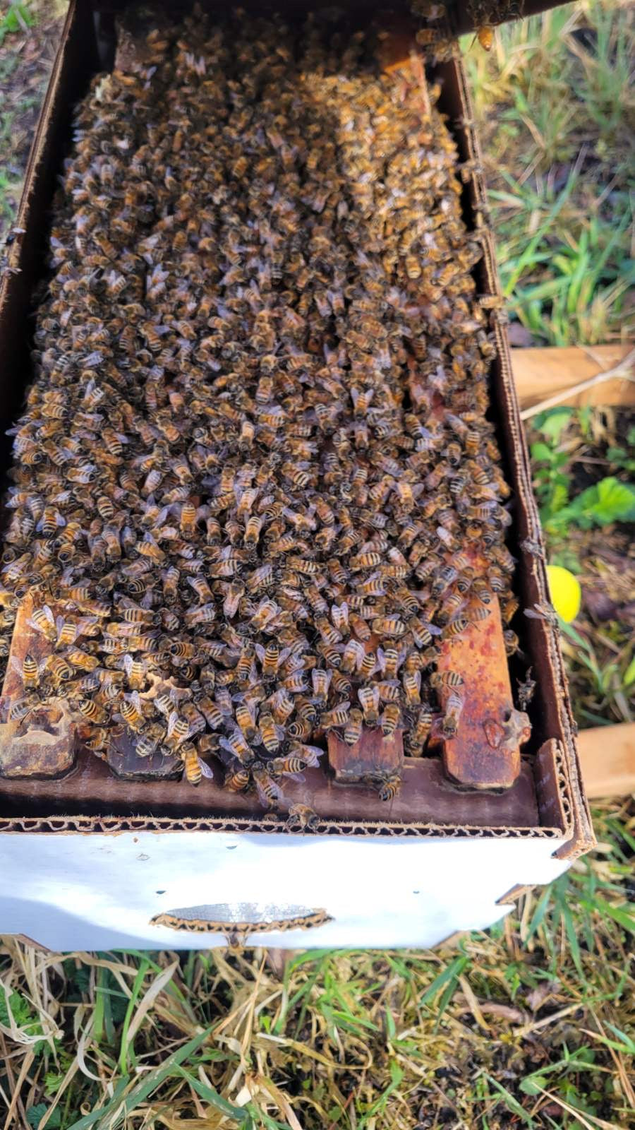 We sell our local bees in complete hive sets. Complete hive sets are two-story, 16 frames total, each story box comes with 8 frames, top lid, bottom board, full with bees, brood, a laying queen and some honey for $320. Another option we have is two story box that comes with 20 frames, which have top lid, bottom board, full with bees, a laying queen, brood and some honey for $360.